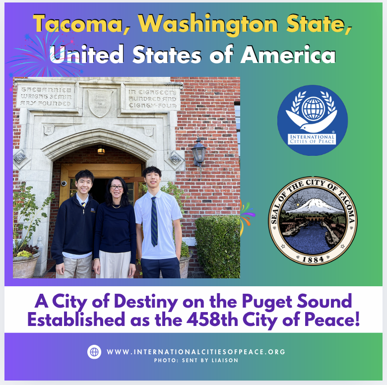 A vibrant city situated on the Puget Sound, home to around 225,000 Tacomans, the community represents many different races and ethnicities and is home to the Puyallup tribe among other Native American peoples. “…I believe our destiny as the City of Destiny is to lead with peace, justice, and inclusivity,” writes Ms. Ji Yon Kim, who was born in South Korea but for 13 years has lived, taught at the Annie Wright School, and raised four children in her beloved community, Tacoma. “The International Cities of Peace initiative inspires me because it aligns with my values of community, education, and empowering youth to be changemakers.” Congratulations to the Kim family and to the Annie Wright School, which is one of the inspirations for this new, 458th City of Peace. The world is with you.