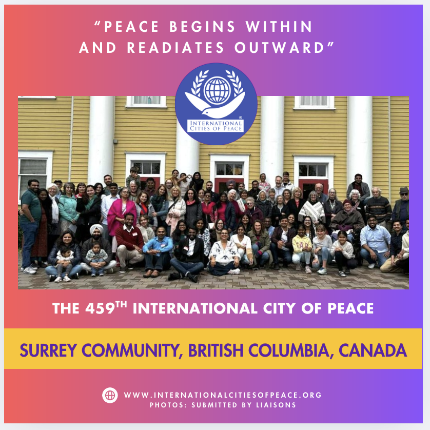 “I believe peace begins within and radiates outward — shaping how we live, work, and connect with others. ” This message from Ms. Shashi Das, the new Liaison between Surrey and our association of International Cities of Peace, is the essence of International Cities of Peace: a reaching out from the goodness within. Shashi’s journey began with the Heartfulness meditation centers in 2009, inspired by her parents’ gentle example as meditators and trainers. What started as quiet curiosity grew into a steady path of inner exploration and service. The mission of Surrey, as it rises to an International City of Peace, “is to foster a culture of peace,” writes Shashi, “by making Heartfulness meditation and relaxation practices accessible to all, while collaborating with diverse communities to promote inner transformation and collective harmony.” Peace inside and out. Congratulations to the community of Surrey and may peace radiate its power of heart.