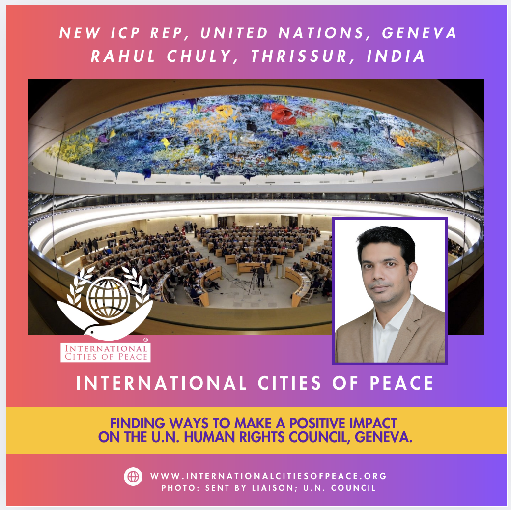 Mr. Rahul Chaly, Liaison for Thrissur City of Peace, serves the Rotary Club of Trichur West, Karale, India, as President and Zonal Chair of Rotary International Peace and Conflict Resolution (2025-26). Rahul has received many awards and distinguishments. He will join other ICP Reps in bringing, when opportunities arise, the voice of International Cities of Peace to the Human Rights Commission located in Geneva. He holds Credentials with the U.N. Office for Disarmament Affairs for Youth and Disarmament. Congratulations and welcome to ICP Central, Rahul, you will do well in representing the Liaisons of International Cities of Peace around the globe.