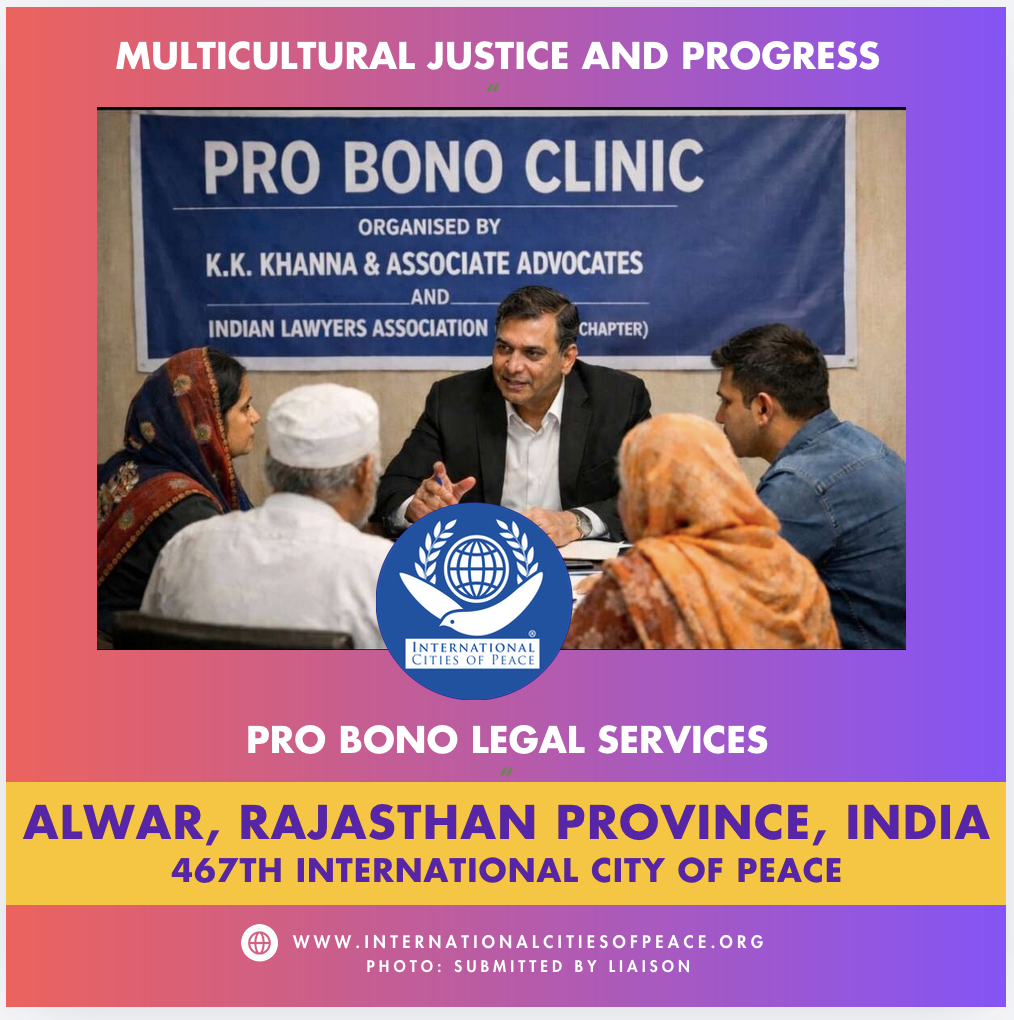 GENEROSITY. Justice and progress. Alwar City is 150 km south of Delhi, India, with 3.67 million people, a multicultural population 90% Hindus; 4.3% Muslim with smaller minorities of Jains and Sikhs. New ICP Liaison Gitesh Khanna and other advocates, mediators and arbitrators with the Indian Lawyers Association have, by applying to establish the 467th City of Peace, put forward a vision to become a model city for communal harmony and intercultural dialogue for resolving communal, business, and civil disputes peacefully. We commend Advocate Khanna and his associates for their innovative, inclusive approach to heal the stresses of a growing metropolis with a minority population that needs their services to thrive. They set an example.