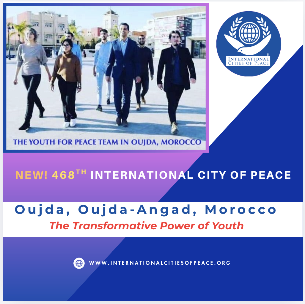 MOROCCO, NORTH AFRICA. “Thank you again,” new ICP Liaison Zakaria el Hamel writes, “for your support and for the inspiring work of the International Cities of Peace in advancing peace around the world. We are honored to be part of this global family working together for a more peaceful future.” Zakaria is a dedicated human rights and peace activist in Oujda, Morocco, which has a population of 1/2 million. He and a collaboration of young Moroccans are intent on practical actions led by their visionary group, Youth for Peace & Dialogue Between Cultures. Like many cities, Oujda faces youth unemployment, social inequality, and low civic participation, and this group’s initiatives will drive positive change. “I have seen the transformative power,” writes Zakaria, “of empowering citizens to take active roles in creating safer and more inclusive societies.” Free Services from International Cities of Peace can help them Transform Oujda, Morocco as a true City of Peace. We are with you!